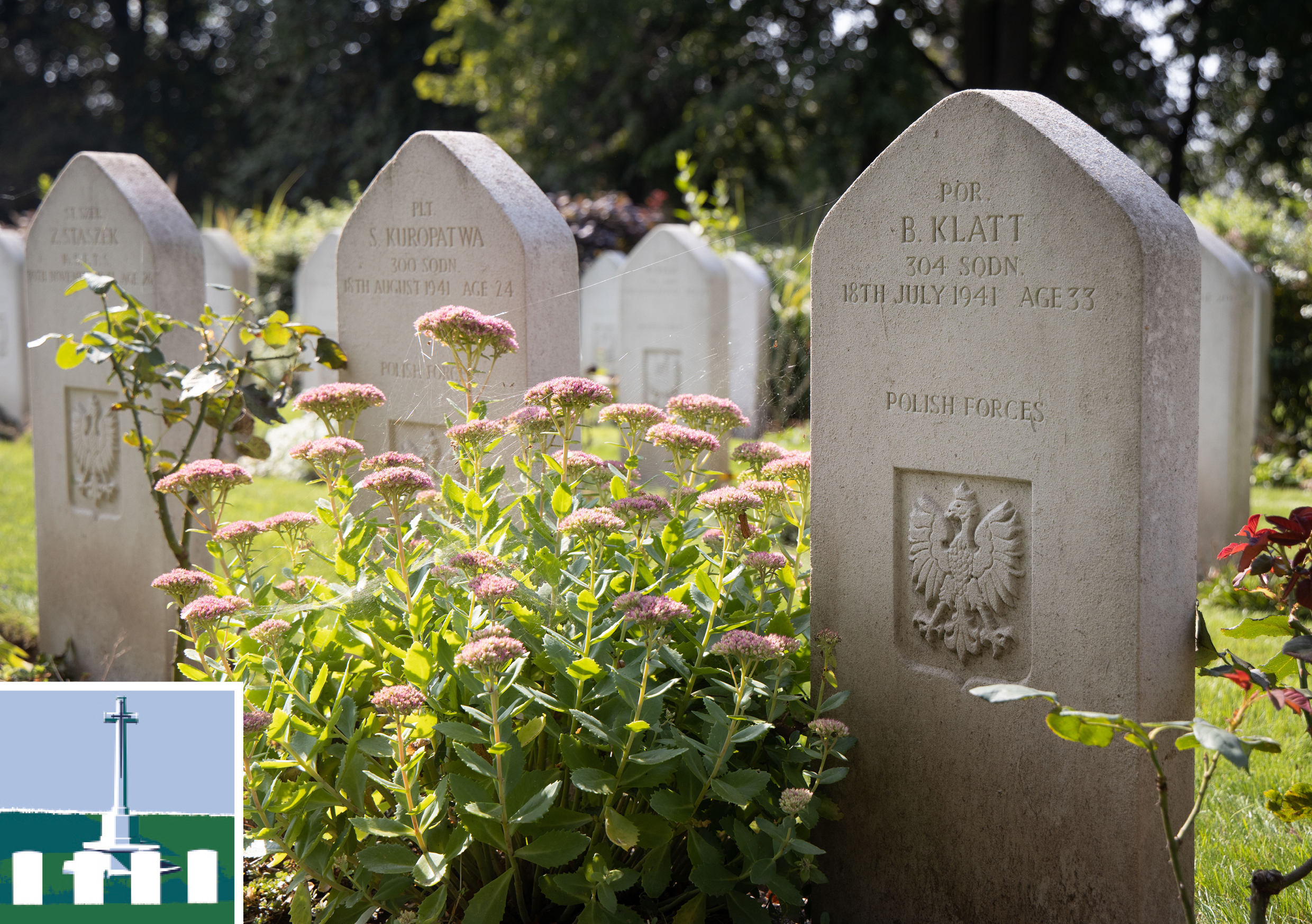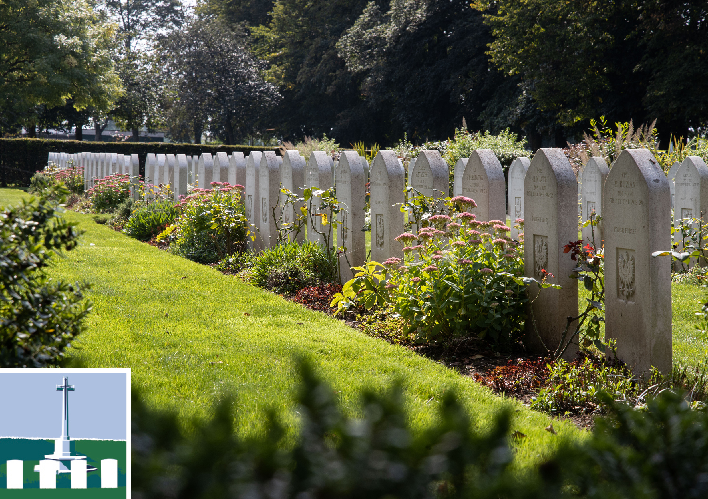 The Polish military authorities naturally took a great interest in how these graves were maintained, and senior figures from the Polish Air Force made a number of visits to the cemetery to discuss maintenance with the cemetery superintendent, Mr Wiggins. One suggestion made by Squadron Leader Nicolas Sasinowski, Chaplain to the Polish Air Force, was to cover the graves in red and white chippings, leaving a small space in the shape of a cross bare for planting, although this idea was tactfully declined by the Commission. The Commission did however agree to the request to plant red and white flowers around the graves, and the Polish authorities also arranged for the erection of a stone memorial cross in the plot.