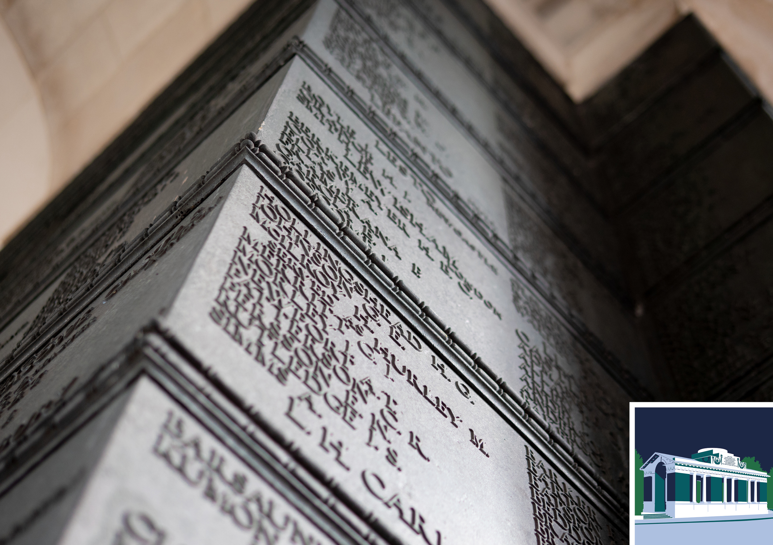This design would ultimately be constructed at Tower Hill. The finished memorial consisted of a vaulted corridor in Portland stone, open at either end, with the names of the dead cast in bronze panels attached to the eight stone piers. Additional sculpture work was carried out by William Reid Dick.
