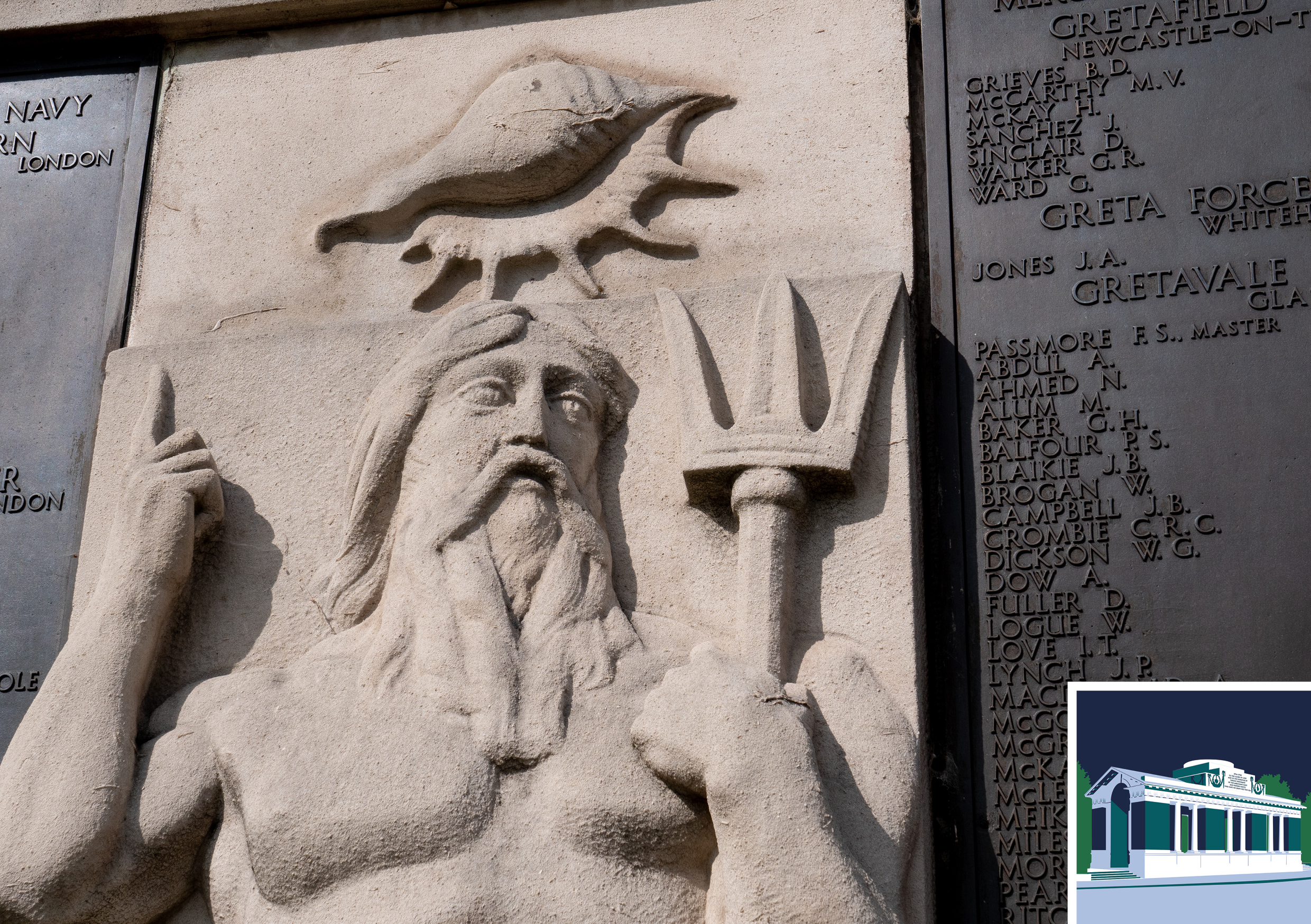 The new extension to the memorial incorporated a number of sculptures by Charles Wheeler, including seven allegorical figures representing the Seven Seas. The one shown here represents the Atlantic Ocean.