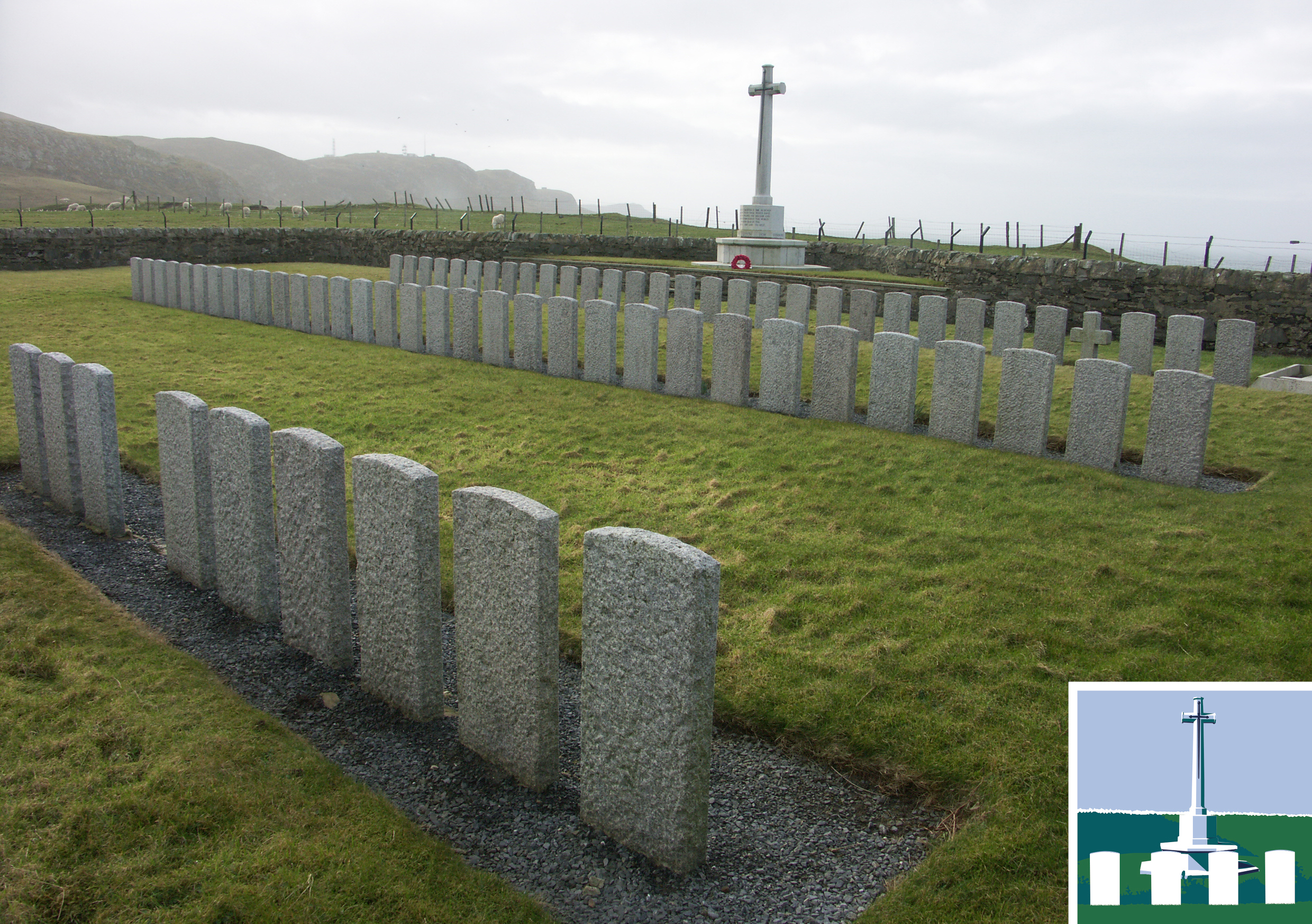 This isolated cemetery was begun following the sinking of the troop ship HMS Otranto off Islay in October 1918 and is the final resting place of 74 British servicemen, 71 being crewmen of the Otranto.