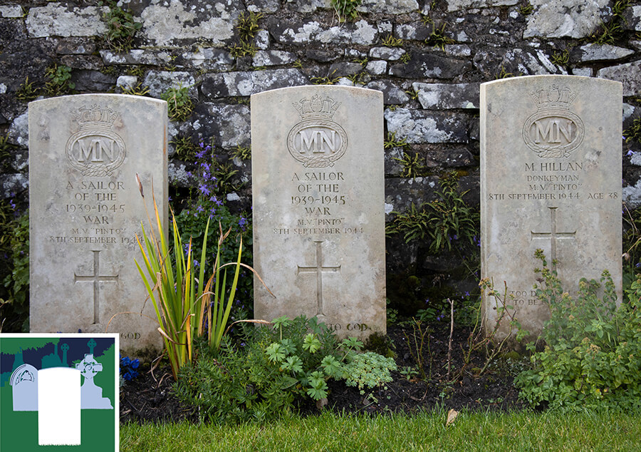Others buried here were killed in action or in training accidents in and around the United Kingdom. On 3 April 1917, HMS Jason, an Alarm-class torpedo gunboat converted into a minesweeper, was conducting operations when she struck a mine off Coll in the Inner Hebrides. Jason sank, killing 30 of the crew, including Stoker 1st Class James Blackman, who is buried in the cemetery.  Blackman is one of three of the Jason’s crew killed in the incident to be buried here. The remainder of James’s fallen comrades have no grave but the sea and are commemorated on the CWGC Naval Memorials.