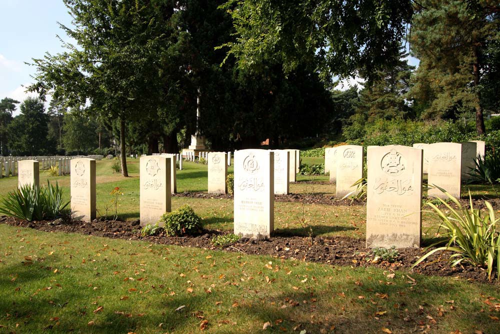 At Brookwood in Surrey, there are more than 50 war graves to soldiers who came from India, Pakistan, and Nepal. 30 of those are in Brookwood Cemetery, where they are buried in the Muslim plot in the North-West corner – the first Muslim Cemetery in Britain. Many of the burials date from the First World War. The first soldier to be buried in this plot was Sepoy Ahmad Kahn of the 3rd Sapper and Miners. He was the son of Sajawulmulk of Thutha-Rai-Bahadur, Kharian, Gujrat, Punjab. He had died of wounds on a hospital ship on the way from France to the hospital at Netley.
