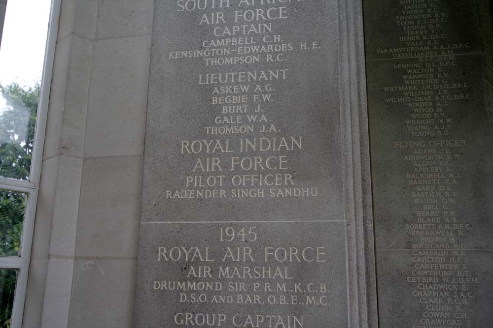 Elsewhere on the memorial is Pilot Officer Rajender Singh Sandhu who was born in Pakhopur in Amritsar in September 1923. After the outbreak of the Second World War, he joined the Royal Indian Air Force. He was commissioned as a pilot officer in June 1943 and began training to become a fighter pilot. Rajender was nearing the end of his training in September 1944, when he failed to return from a training flight. His Spitfire was later reported to have crashed into the sea.