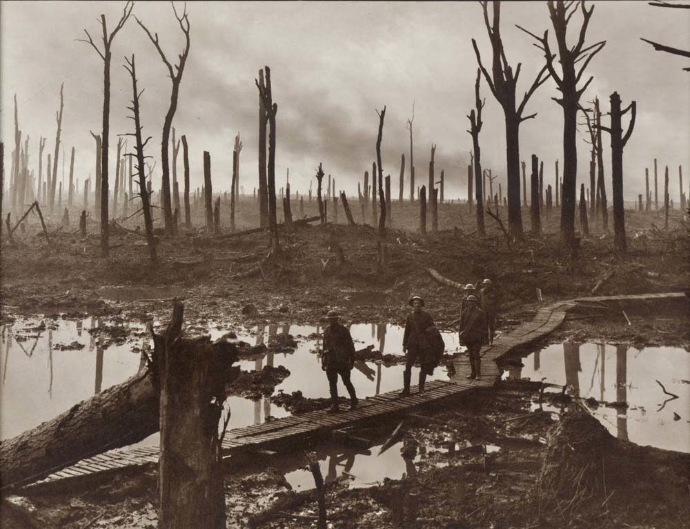 Australian soldiers navigate duckboards across the swampy ground near Chateau Wood (Wikimedia Commons)