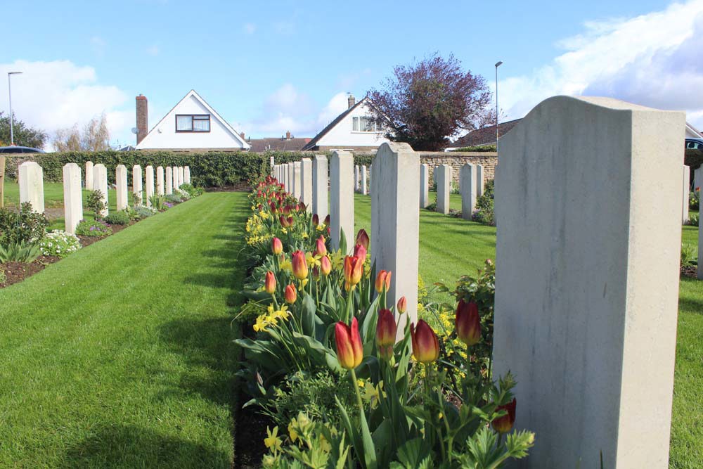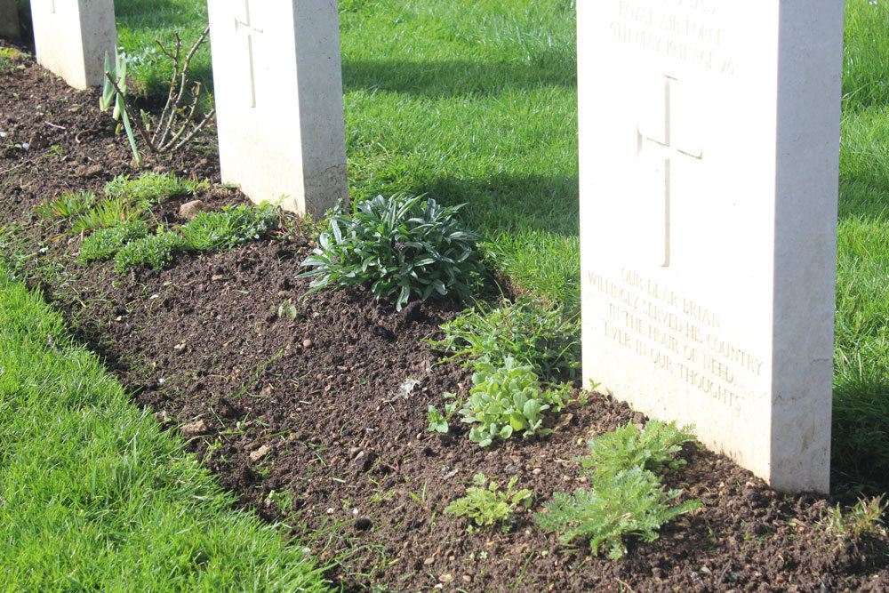 Like in most CWGC planting schemes, plants repeat every five headstones at Cranwell, creating a theme as you look down the borders and across the whole site.