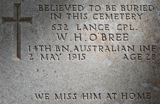 Over 14,000 kms from home, on the ridge high above ‘Shrapnel Valley’ and CWGC’s Beach Cemetery, in Gallipoli, is Lance Corporal William Henry O’Bree’s headstone. Born in Moulamein NSW but educated in Swan Hill VIC, he was working on his uncle’s farm near Swan Hill when war began, and he enlisted within weeks. He sailed for overseas service in December 1914, spending time in Egypt and Gallipoli.