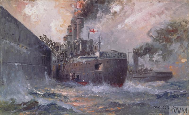 The Vindictive at Zeebrugge: Storming the Zeeburgge Mole, Charles John de Lacy, 1918 (© IWM Art.IWM ART 871)