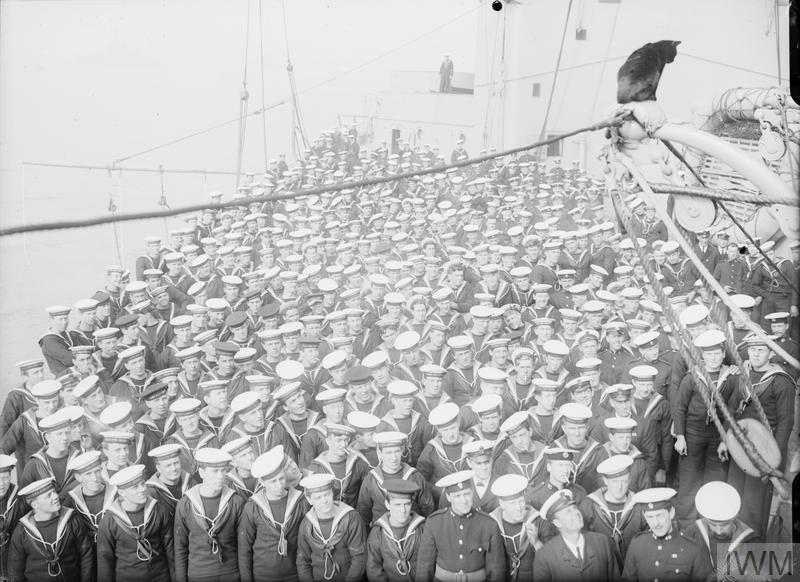 The crew of HMS Vindictive aboard the ship back home in Dover. Vindictive landed troops on the mole at Zeebrugge (© IWM Q 55568)