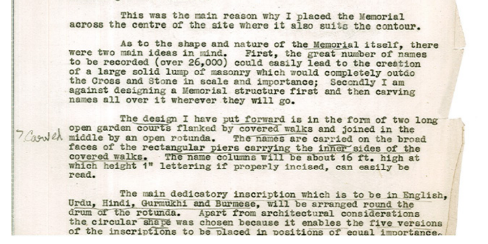 Often, the architect’s own experiences would dictate the material used. H. J. Brown, who worked on CWGC sites across India, Pakistan and Burma after the Second World War, provided a detailed set of notes alongside his architectural plans for Taukkyan War Cemetery and Rangoon Memorial stating: