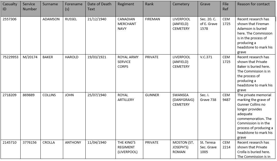 If you are related to one of the above casualties and can provide us with the documentation, please contact ourĀ Enquiries Team.