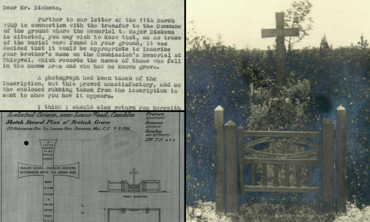 Other items in the archive include correspondence concerning the private memorial of Major Cedric Charles Dickens, the grandson of the celebrated author Charles Dickens. Major Dickens, who was a member of the 13th (Kensington) Battalion of the London Regiment, was killed on the 9 September 1916. His men erected a wooden marker to his memory, which was later replaced with a stone memorial by his family. Over the years the Commission sought permission from the family to exhume Major Dickens’ body and rebury him in one of its war cemeteries, to ensure his grave would be better protected and cared for in perpetuity. During the 1940’s the family agreed to allow his exhumation to take place, but when the location of the memorial was exhumed, no body could be found, despite extensive searching taking place in the immediate surrounding location. He is now listed on the Thiepval Memorial as one of the missing.