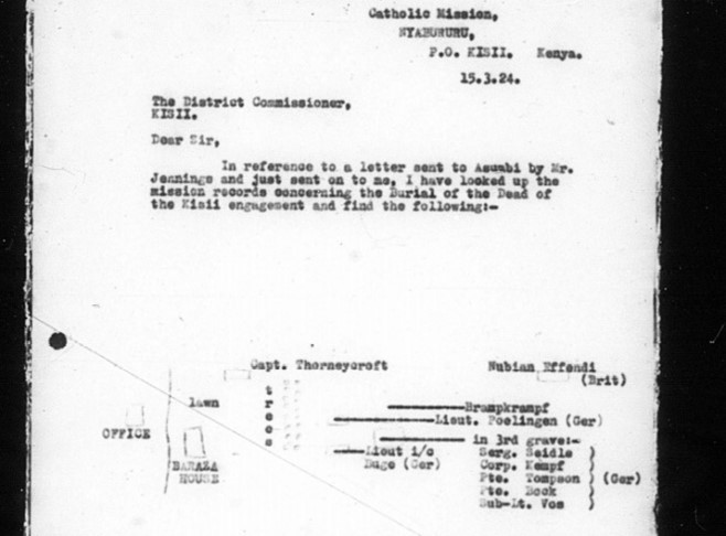 Doyle also left letters, and these indicated the church at the Nyabururu Mission Station could be linked to war graves. Documents also showed this mission’s founder, Father Wall, conducted war grave burials in 1914 but it was more likely these burials took place elsewhere – the two graves on the grounds are not related to the world wars.