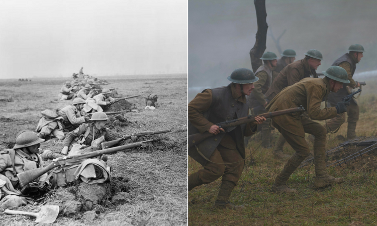 French 22nd Division and British 20th Division covering a road near Nesle, 25 March 1918, © IWM Q10810 (left) and a scene from the new film adaption of Journey's End (right)