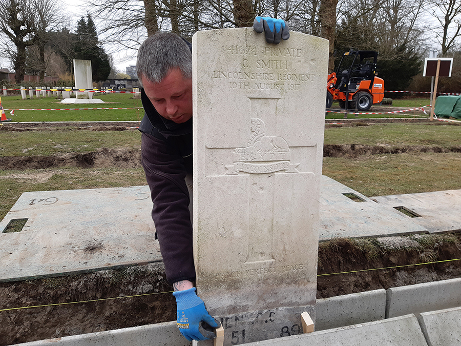 Careful removal of the 88 original headstones was important, as conservation of the original stones is essential to preserve their heritage value. An original Commonwealth War Graves Commission headstone, as hand-carved over 100 years ago, can be recognized by the painted markings at the bottom of the headstone. This can only be seen very rarely, as it is normally hidden under the soil.