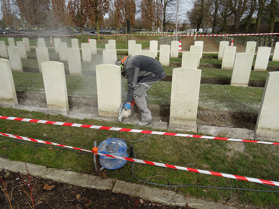 Beneath each row of headstones are concrete foundations that hold the headstones in place. However, as the ones at Gent City Cemetery were originally placed at the end of the First World War, they lacked the iron reinforcements we commonly use today. As such, the original concrete foundations had begun to crack and wear out.
