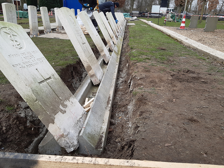 Thirty-two prefab concrete and iron-reinforced beams of 3 meters each, specially developed for the CWGC, were delivered in Gent City Cemetery as new foundations for the original headstones. The highest priority was to record the exact location of each grave. Before the old foundations were broken out, a meticulous laser measurement was done to register the exact grave and headstone locations.