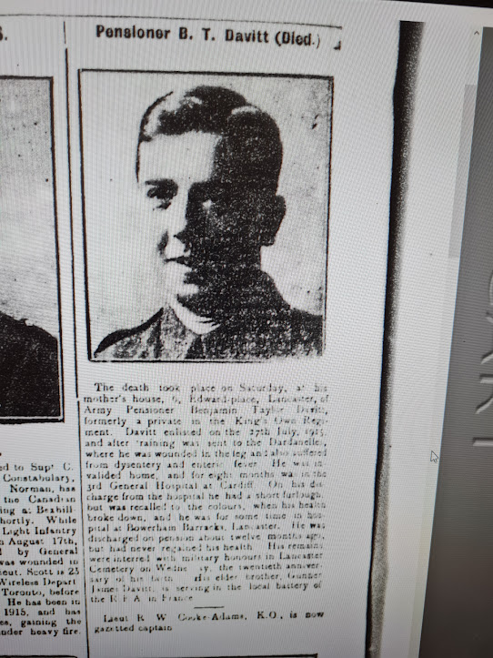 Private Benjamin Taylor Davitt 19795, 6th Bn., King's Own (Royal Lancaster Regiment)