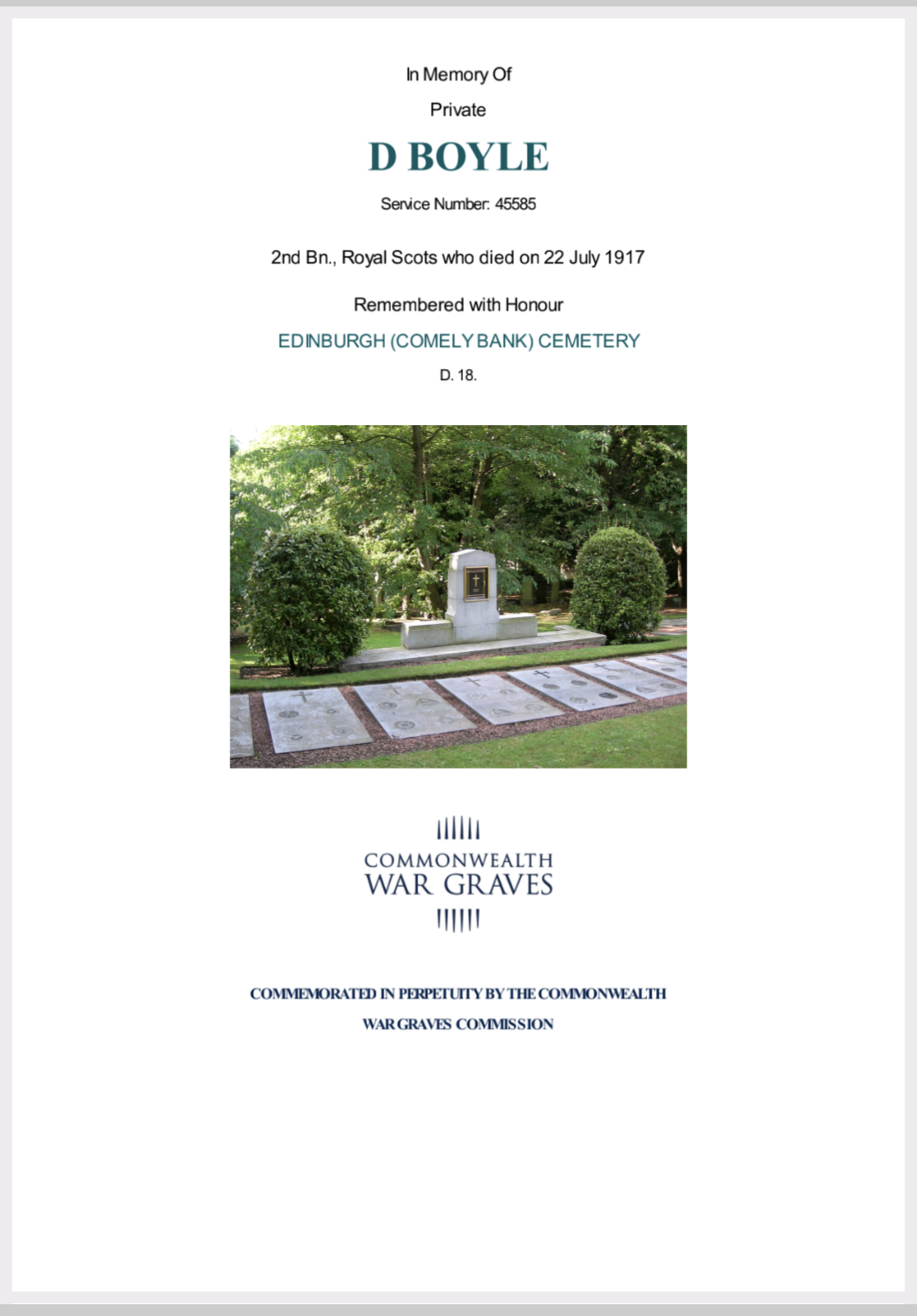 Private Daniel Boyle. 2nd Bn. Royal Scots, attd. Labour Corps. First World War Army United Kingdom EDINBURGH (COMELY BANK) CEMETERY By Hilary Fyfe United Kingdom Read more