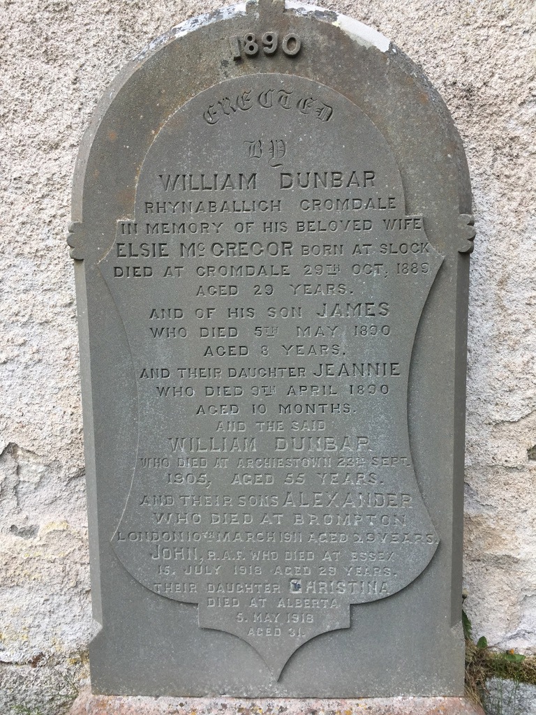 Buried: Duthil Parish Churchyard in the family grave. Also remembered on the gravestone Father William (1850 - 1905) Mother Elsie m.s. McGregor (1860 - 1889) Siblings Alexander (1882 - 1911) James (1882 - 1890) Christina (1888 - 1919) Jeannie (1889 - 1890)