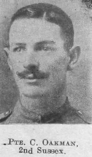 Lance Corporal G/7302 Charles William Oakman, 7th Battalion, Royal Sussex Regiment, was born 11th of September 1877 at Basingstoke, one of two children, the son of William Oakman (1855 to 1883) and Ellen nee Monger (1854 to 1905) of Charter Alley, Basingstoke, Hampshire.