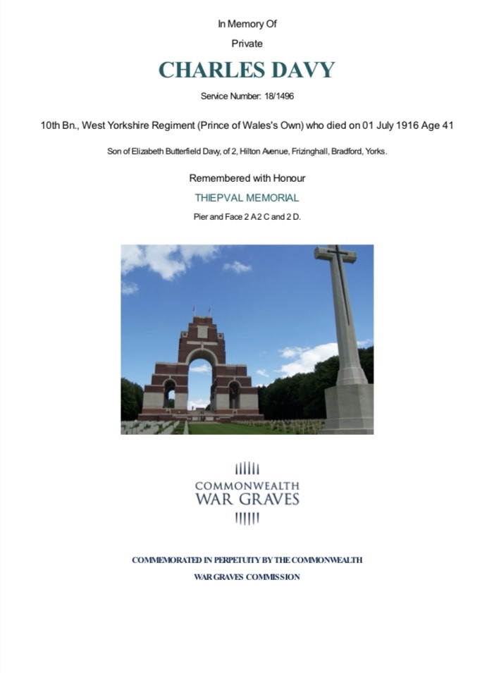 He is also remembered on the family headstone at Undercliffe Cemetery, Bradford: ALSO OF CHARLES DAVY, SON OF THE ABOVE, KILLED IN ACTION ON THE SOMME JULY 1ST 1916, IN HIS 41ST. YEAR