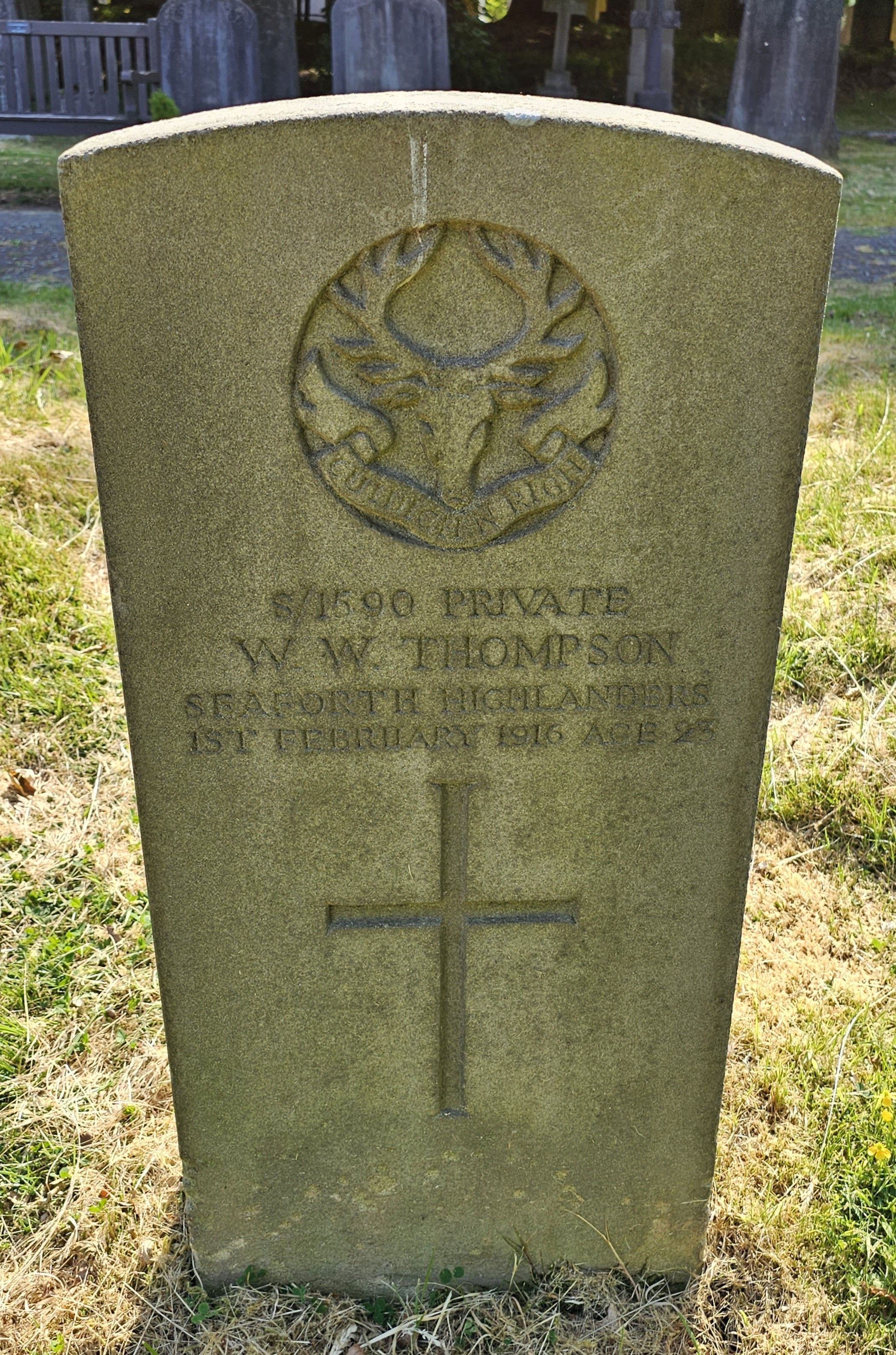 PRIVATE WILFRID WILSON THOMPSON Service Number: S/1590 Seaforth Highlanders-8th Bn. Died 01 February 1916 Age 23 years old H. CE. 66. Son of the late John Wilson Thompson and of Fanny Thompson (stepmother), of 96, St. Mary's Gate, Lancaster.