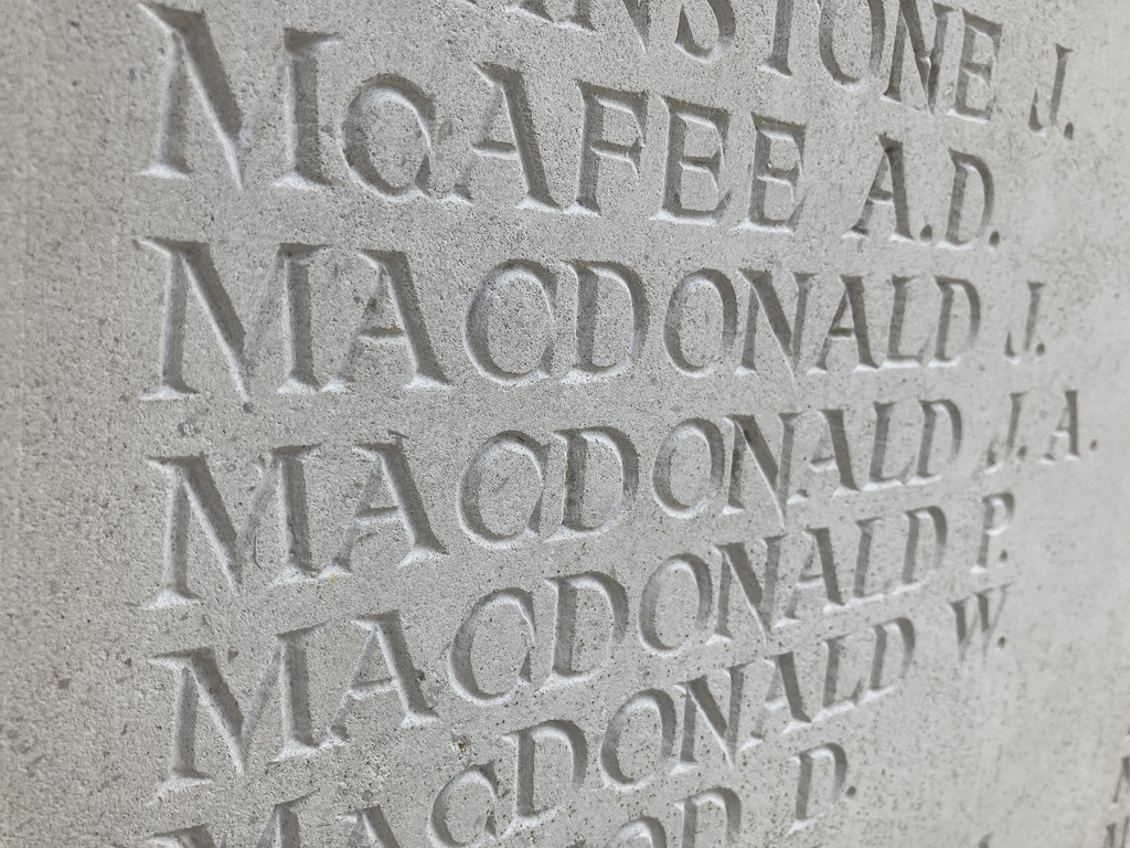 Also remembered on the Kingussie War Memorial and Kingussie and Insh Memorial in Kingussie Parish Church and the Ring of Remembrance, Notre Dame de Lorette.
