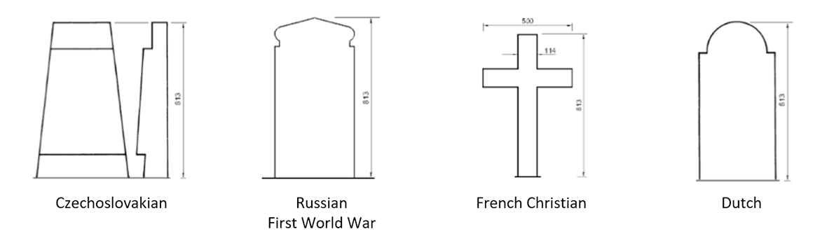 Occasionally, the headstone shapes can vary due to the faith of the person they commemorate. French war graves are marked with a cross shaped headstone for Christian burials and a regular shaped marker for other faiths.